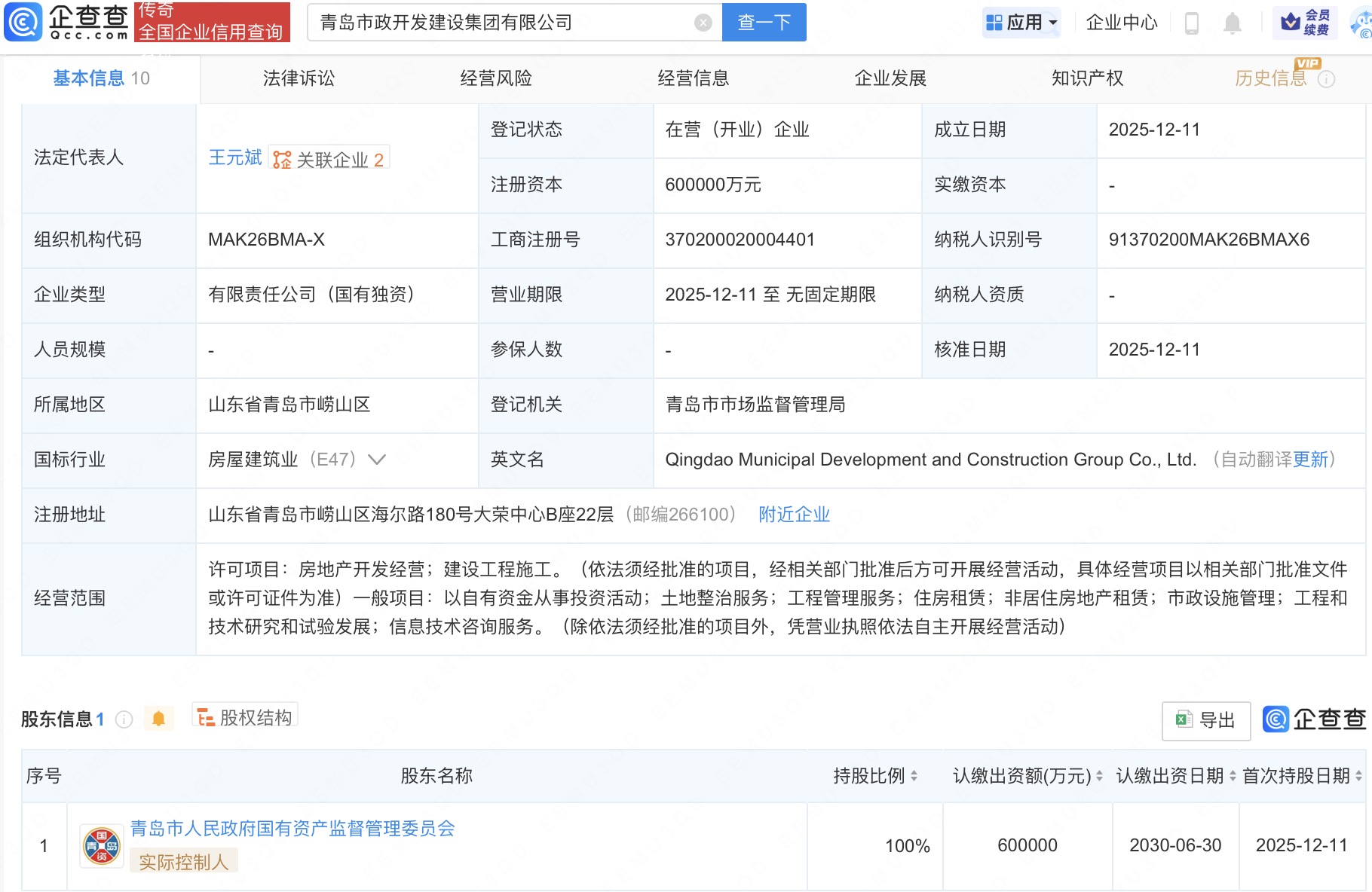 近日,青岛市政开发建设集团有限公司成立,法定代表人为王元斌,注册资本60亿人民币,经营范围含房地产开发经营、建设工程施工、以自有资金从事投资活动、土地整治服务等。企查查股权穿透显示,该公司由青岛市人民政府国有资产监督管理委员会全资持股。